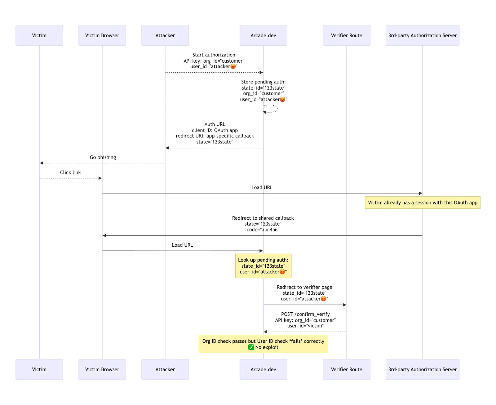 Cross-tenant attacks: A malicious actor with an Arcade account tricks a victim who uses a completely different Arcade-based application. Previously possible in some cases where trust relationships and OAuth apps were shared. Now prevented in all cases, because user verification ensures the user completing the flow matches the user who initiated it, and OAuth URIs must be unique