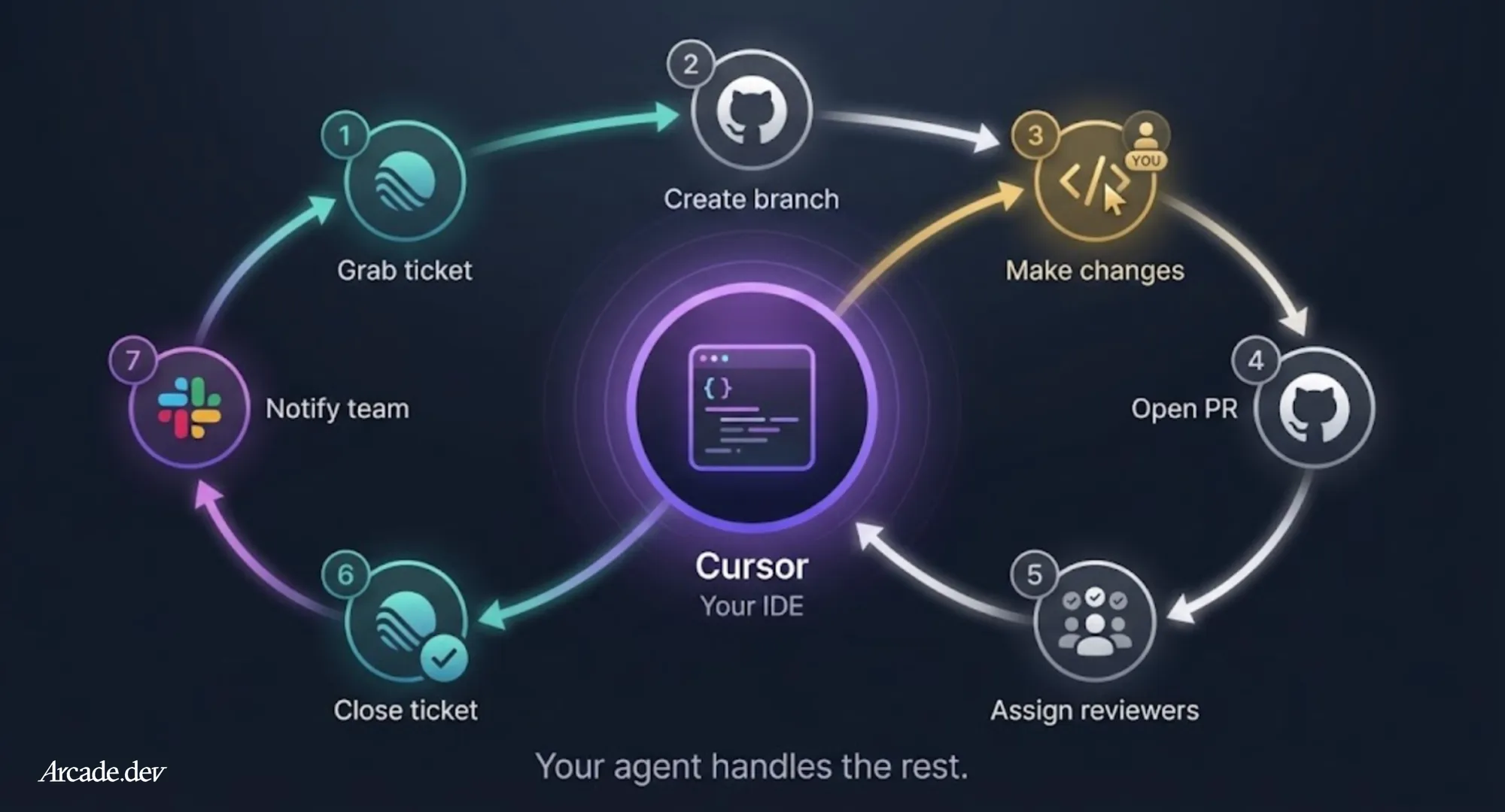 Every engineer runs this loop on repeat: grab a ticket from Linear, create a branch in GitHub, make your changes, open a PR, assign reviewers, close the ticket, and notify the team in Slack. Your agent already helps you code. With an Arcade Gateway, it can handle the rest too.