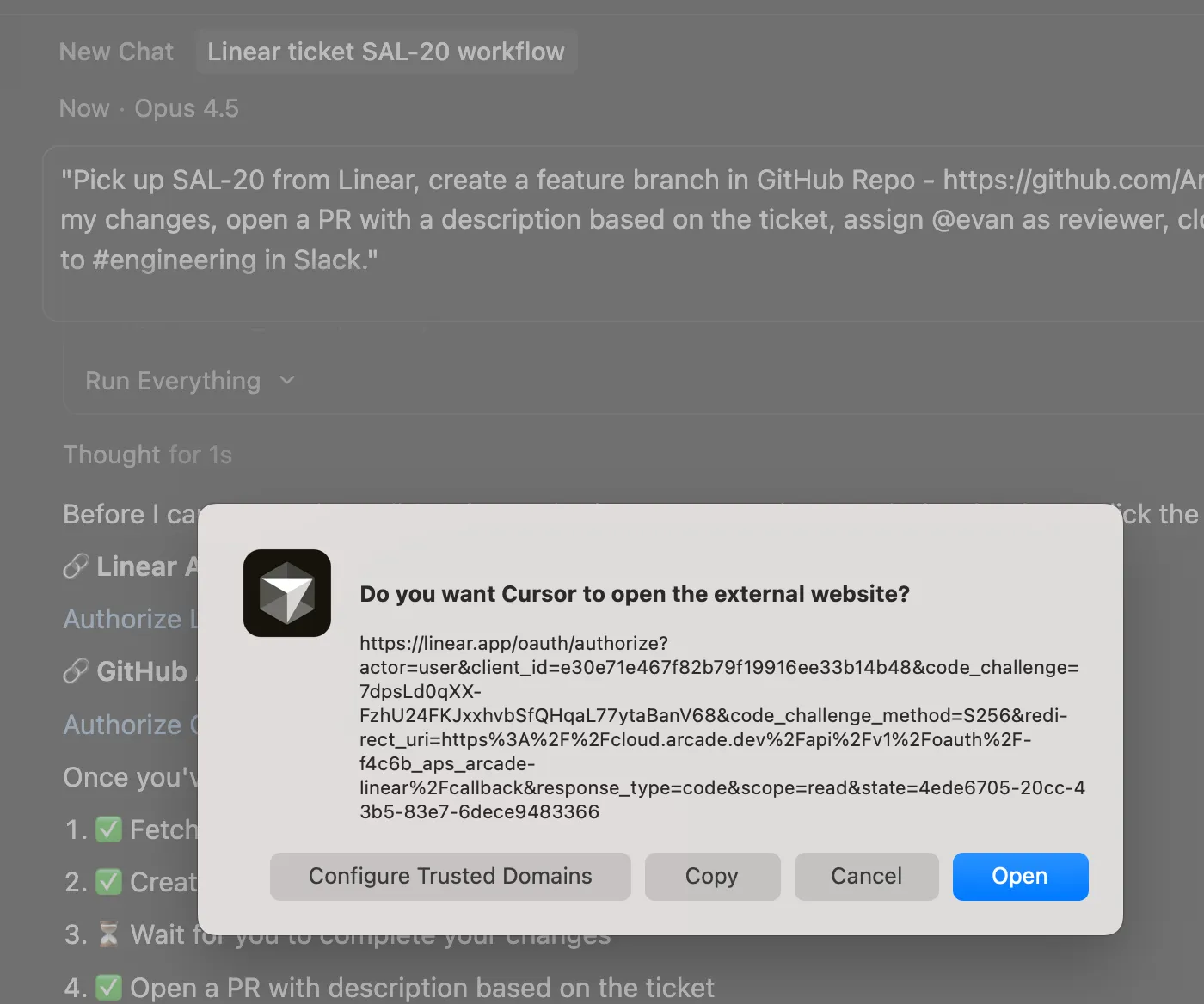 These are first-party OAuth flows directly with each provider: GitHub, Linear, Slack, the same flows your security team already trusts. Once authorized, Arcade handles token refresh and lifecycle automatically.