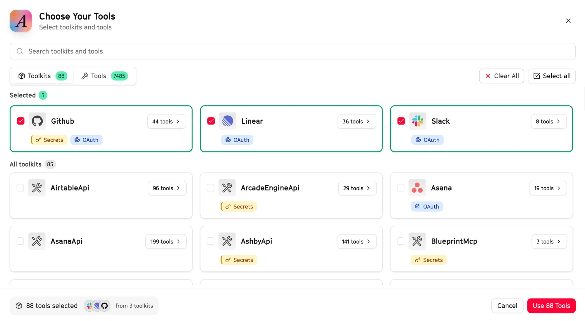 Your agent now has access to GitHub, Linear, and Slack through a single connection.