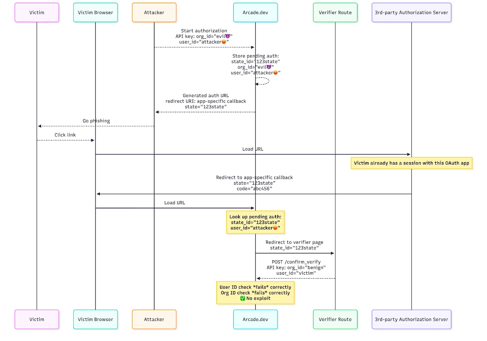 Cross-tenant attacks: A malicious actor with an Arcade account tricks a victim who uses a completely different Arcade-based application. Previously possible in some cases where trust relationships and OAuth apps were shared. Now prevented in all cases, because user verification ensures the user completing the flow matches the user who initiated it, and OAuth URIs must be unique