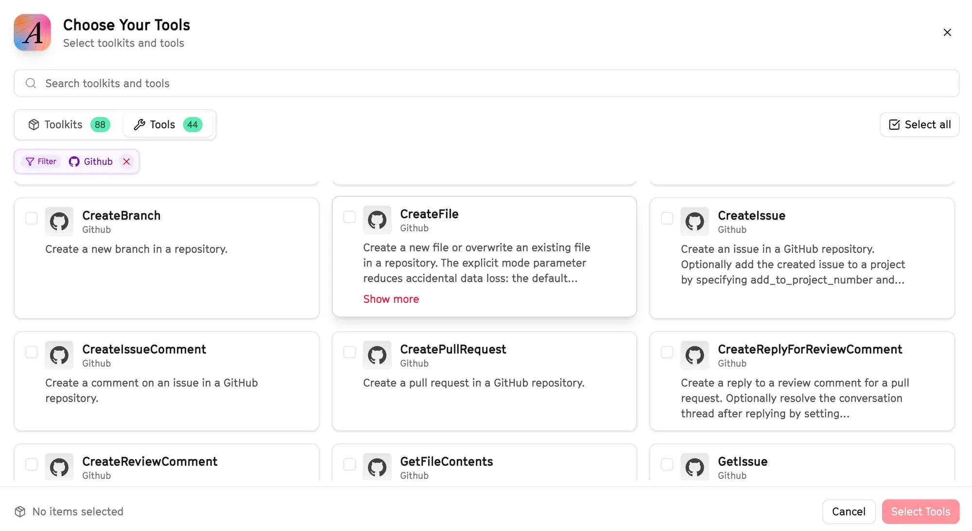 Instead of configuring multiple MCP servers, you select the tools you need—GitHub, Linear, Slack, Gmail, whatever your workflow requires—and Arcade bundles them into a Gateway. You get one URL that provides access to all of them.