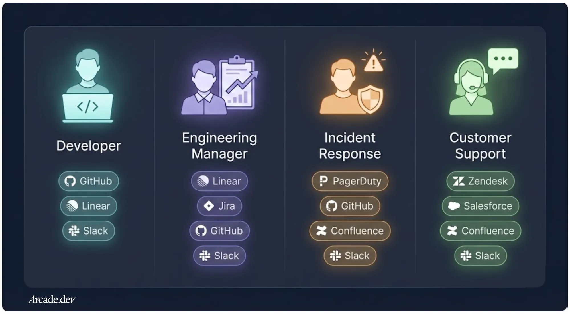 Different teams need different tools. Your engineering team needs GitHub and Linear. Support needs Zendesk and Confluence. Sales needs Salesforce and HubSpot.