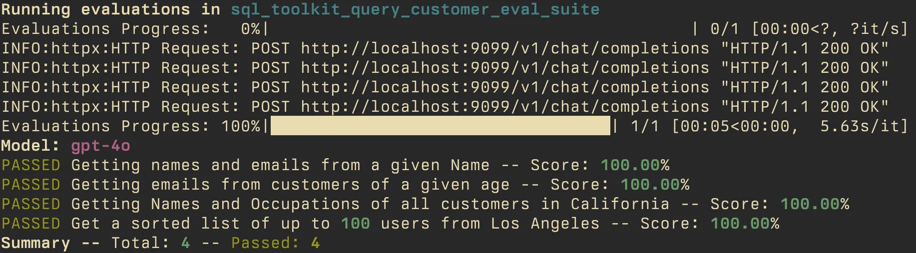 This will connect to Arcade, and run each case on our evaluation suite. The output should look like this: