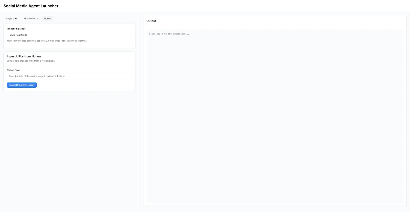 - single-post mode: Uses all provided URLs as context to generate a single, consolidated post.